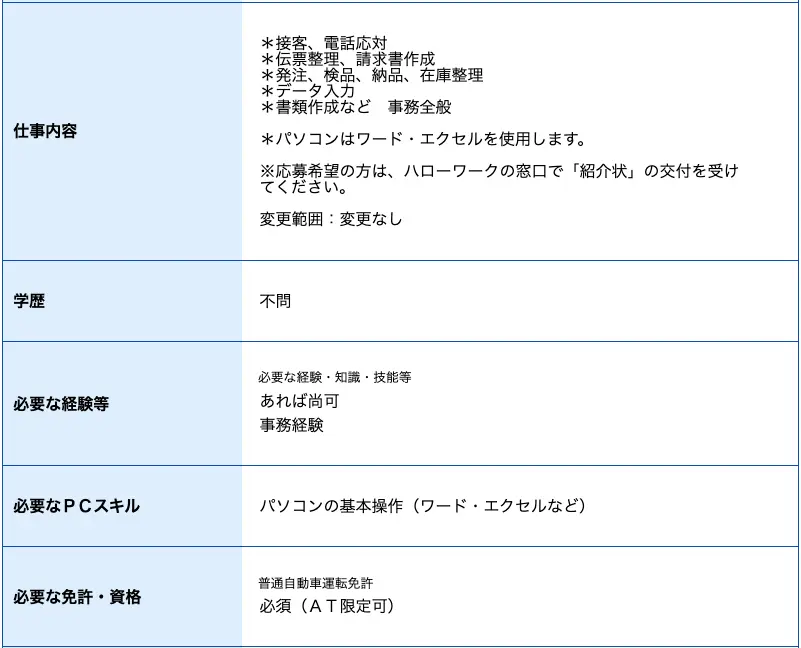 「必要な経験等」に「Excel・Word情報入力程度」とあるので、パソコン作業は決まった操作に限られると思われます。また、「来客対応」や「電話対応」、「書類提出等の外勤」とあるので、接客対応やフットワークの軽さが評価されそうです。